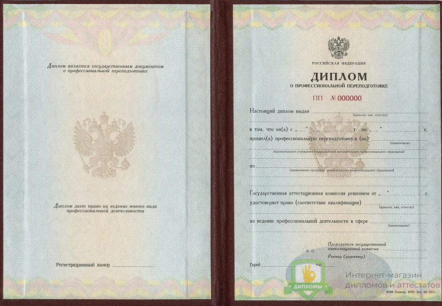 Прибрести диплом о профессиональной переподготовке 1996 - 2012 год вы можете в компании «ОК-Дипломы». Работаем на профильном рынке более 20 лет, предлагая клиентам высококачественный сервис и разумные цены. У нас диплом о профессиональной переподготовке 1996 - 2012 год выполняется на оригинальном бланке Гознак, дополняется подлинными подписями и печатями.